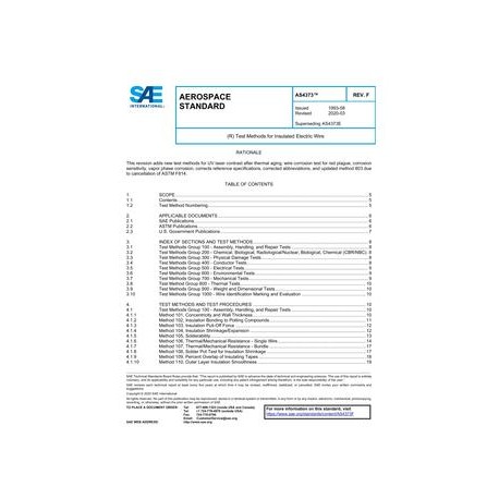 This standard describes test methods for insulated, single conductor, electric wire intended for aerospace applications. Particular requirements for the wire being tested need to be specified in a procurement document or other detail specification. Suggested minimum requirements are included in the notes at the end of some of the test methods. SAE Performance Standard AS4372 uses some of the tests in this document for evaluating comparative performance of aerospace wires.