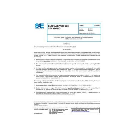 This SAE standard outlines the steps and known accepted methodologies and standards for linking Model VV with model-based product reliability assessments. The standard¿¿¿s main emphasis is that quantified values for model-based product reliability must be accompanied by a quantified confidence value if the users of the model wish to claim use of a ¿¿¿Verified and Validated¿¿¿ model, and if they wish to further link into business and investment decisions that are informed by quantitative second-order risk and benefit cost considerations.