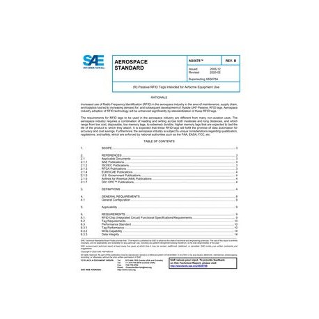 The scope of this document is to: 1 Provide a requirements document for RFID tag manufacturers to produce passive-only UHF RFID tags for the aerospace industry. 2 Identify the minimum performance requirements specific to the Passive UHF RFID Tag to be used on airborne equipment, to be accessed only during ground operations. 3 Specify the test requirements specific to Passive UHF RFID tags for airborne equipment use, in addition to EUROCAE ED-14 / RTCA DO-160 compliance requirements separately called out in this document. 4 Identify existing standards applicable to Passive UHF RFID Tag. 5 Provide a certification standard for RFID tags which will use permanently-affixed installation on airborne equipment.