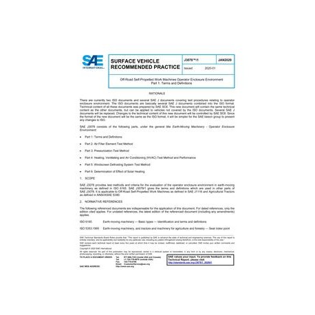SAE J3078 provides test methods and criteria for the evaluation of the operator enclosure environment in earth-moving machinery as defined in ISO 6165. SAE J3078/1 gives the terms and definitions which are used in other parts of SAE J3078. It is applicable to Off-Road Self-Propelled Work Machines as defined in SAE J1116 and Agricultural Tractors as defined in ANSI/ASAE S390.