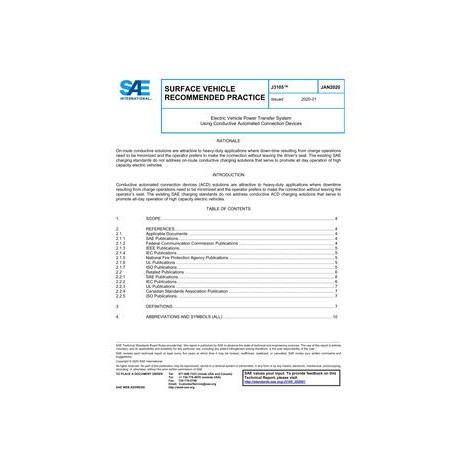 This document covers the general physical, electrical, functional, testing, and performance requirements for conductive power transfer, primarily for vehicles using a conductive ACD connection capable of transferring DC power. It defines conductive power transfer methods, including the infrastructure electrical contact interface, the vehicle connection interface, the electrical characteristics of the DC supply, and the communication system. It also covers the functional and dimensional requirements for the vehicle connection interface and supply equipment interface. There are also sub-documents which are identified by a SAE J3105/1, SAE J3105/2, and SAE J3105/3. These will be specific requirements for a specific interface defined in the sub-document. SAE J3105: Main document, including most requirements.