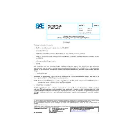 This specification and part standard specifies polytetrafluoroethylene (PTFE) resin material and the dimensional requirements for scarf-cut retainers (backup rings) previously specified by MIL-R-8791 and MIL-R-8791/1. The retainers are intended for use in hydraulic and pneumatic system components as anti-extrusion devices in conjunction with seals and O-rings.