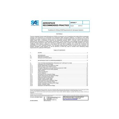 This Aerospace Recommended Practice (ARP) provides guidance on developing requirements for systems that include Integrated Vehicle Health Management (IVHM) capability [REF1], [REF18]. IVHM is increasingly being implemented on military and commercial aircraft. Some examples include the F-35 Joint Strike Fighter (JSF) [REF1] and the AH-64 Apache [REF3] in the military domain, and the B787 [REF4] and A350XWB [REF5] in the commercial domain. This document provides a systematic approach for developing requirements related to the IVHM capabilities of a vehicle system. This document is not intended to repeat general guidelines on good requirements writing [REF13], [REF20]. Instead, the focus is on the unique elements, which need to be considered for IVHM and the resulting specific guidelines that will help define better requirements and hence better systems. The multi-faceted nature of IVHM should include the process of requirements gathering. Therefore, this document presents some guidance on how to go about this task. The document also includes some case studies that illustrate, in a practical manner, what a good set of IVHM requirements might look like. These have been taken from real life examples, but have been generalized for the purpose of this ARP.