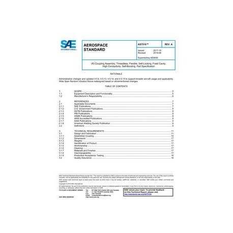 This SAE Aerospace Standard (AS) defines the requirements for a threadless, flexible, high conductive, self-bonding coupling assembly which, when installed on defined ferrules, provides a flexible connection for joining ducting and components in pressurized fluid systems. The assembled coupling is designed to provide interchangeability of parts and components between qualified manufacturers for use from -65 to +265 ¿¿F at 130 psi nominal operating pressures and for the service life of the aircraft system.