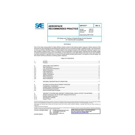 This document outlines the development process and makes recommendations for total antiskid/aircraft systems compatibility. These recommendations encompass all aircraft systems that may affect antiskid brake control and performance. It focuses on recommended practices specific to antiskid and its integration with the aircraft, as opposed to more generic practices recommended for all aircraft systems and components. It defers to the documents listed in Section 2 for generic aerospace best practices and requirements. The documents listed below are the major drivers in antiskid/aircraft integration:1.ARP4754 2.ARP4761 3.RTCA DO-178 4.RTCA DO-254 5.RTCA DO-160 6.ARP490 7.ARP1383 8.ARP1598In addition, it covers design and operational goals, general theory, and functions, which should be considered by the aircraft brake system engineer to attain the most effective skid control performance, as well as methods of determining and evaluating antiskid system performance.For definitions of terms used herein, see Section 7.
