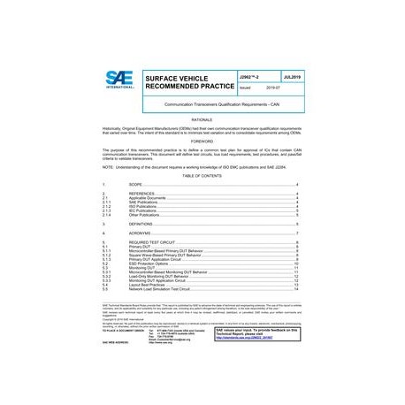 This document covers the requirements for transceiver qualification. Requirements stated in this document will provide a minimum standard level of performance for the CAN transceiver in the IC to which all compatible transceivers shall be designed. No other features in the IC are tested or qualified as part of this recommended practice. This will assure robust serial data communication among all connected devices, regardless of supplier.The goal of SAE J2962-2 is to commonize approval processes of CAN transceivers across OEMs.The intended audience includes, but is not limited to, CAN transceiver suppliers, component release engineers, and vehicle system engineers.
