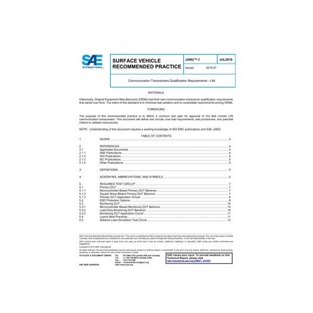 This document covers the requirements for transceiver qualification. Requirements stated in this document will provide a minimum standard level of performance for the LIN transceiver block in the IC to which all compatible transceivers shall be designed. No other features in the IC are tested or qualified as part of this recommended practice. This will assure robust serial data communication among all connected devices regardless of supplier.The goal of SAE J2962-1 is to commonize approval processes of LIN transceivers across OEMs.The intended audience includes, but is not limited to, LIN transceiver suppliers, component release engineers, and vehicle system engineers.