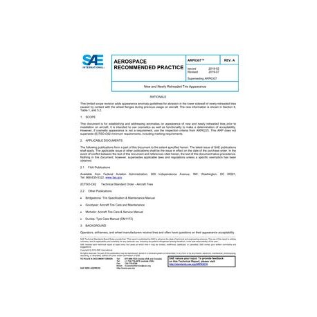 This document is for establishing and addressing anomalies on appearance of new and newly retreaded tires prior to installation on aircraft. It is intended to use cosmetics as well as functionality to make a determination of acceptability. However, if cosmetic appearance is not a requirement, use the inspection criteria from ARP6225, Aircraft Tire Removal Criteria. This ARP does not supersede (E)TSO-C62 minimum requirements, including marking requirements.