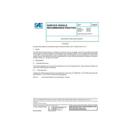 This SAE Recommended Practice is intended to provide the minimum acceptable criteria for snowmobile hand throttle control systems. This recommendation is not intended to cover competition vehicles, nor is it intended to limit development of new and/or improved technology in controls. Although these recommendations are primarily addressed to hand-control systems using an outer flexible conduit with a multiple strand inner cable, the basic requirements of freedom of movement, strength, material, etc., will apply to any system.