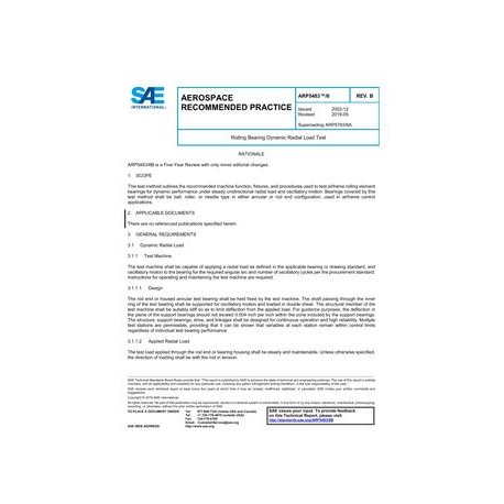 This test method outlines the recommended machine function, fixtures, and procedures used to test airframe rolling element bearings for dynamic performance under steady unidirectional radial load and oscillatory motion. Bearings covered by this test method shall be ball, roller, or needle type in either annular or rod end configuration, used in airframe control applications.