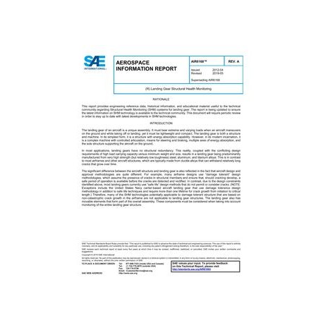 This SAE Aerospace Information Report (AIR) discusses past and present approaches for monitoring the landing gear structure and shock absorber (servicing), opportunities for corrosion detection, methods for transient overload detection, techniques for measuring the forces seen by the landing gear structure, and methods for determining the fatigue state of the landing gear structure. Landing gear tire condition and tire pressure monitoring are detailed in ARP6225, AIR4830, and ARP6137, respectively. Aircraft Brake Temperature Monitoring Systems (BTMS) are detailed in AS1145.
