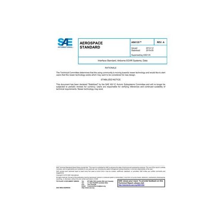 This standard defines the data interfaces between a host aircraft ("platform") and an Electro-Optic/Infrared (EO/IR) sensor. These data interfaces cover various types of data including: imagery, metadata, command, status, and responses (CSR), geospatial postion, time, test and maintenance, and hand-controller. This standard does not cover mechanical or electrical interfaces.
