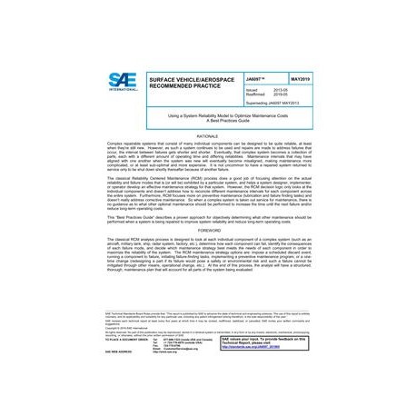 SAE JA6097 ("Using a System Reliability Model to Optimize Maintenance") shows how to determine which maintenance to perform on a system when that system requires corrective maintenance to achieve the lowest long-term operating cost. While this document may focus on applications to Jet Engines and Aircraft, this methodology could be applied to nearly any type of system. However, it would be most effective for systems that are tightly integrated, where a failure in any part of the system causes the entire system to go off-line, and the process of accessing a failed component can require additional maintenance on other unrelated components.