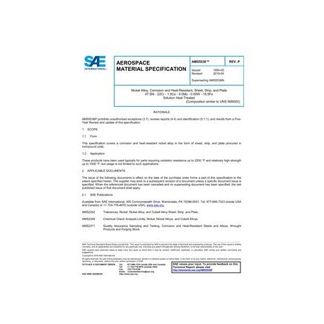 SAE AMS5536P Nickel Alloy, Corrosion and Heat-Resistant, Sheet, Strip, and Plate 47.5Ni - 22Cr - 1.5Co - 9.0Mo - 0.60W - 18.5Fe Solution Heat Treated