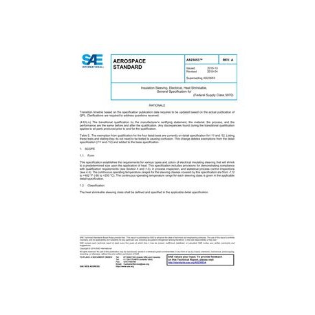 This specification establishes the requirements for various types and colors of electrical insulating sleeving that will shrink to a predetermined size upon the application of heat. This specification includes provisions for demonstrating compliance with qualification requirements (see Section 4 and 7.3), in process inspection, and statistical process control inspections (see 4.4). The continuous operating temperature ranges for the sleeving classes covered by this specification are from -112 to +482 degrees F (-80 to +250 degrees C). The continuous operating temperature range for each sleeving class is given in the applicable detail specification.