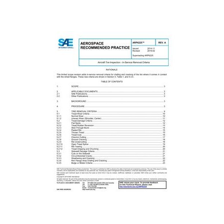 This document is for establishing tire removal criteria of on-wing civil aircraft tires only. This document is primarily intended for use with commercial aircraft, but may be used on other categories of civil aircraft, as applicable. The criteria are harmonized with the Care and Service Manuals of the tire manufacturers for both radial and bias tires.