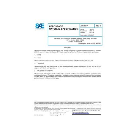 SAE AMS5592G Iron-Nickel Alloy, Corrosion and Heat Resistant, Sheet, Strip, and Plate 44Fe - 18.5Cr - 35Ni - 1.15Si Solution Heat Treated
