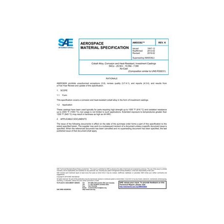 SAE AMS5382K Cobalt Alloy, Corrosion and Heat-Resistant, Investment Castings 54Co - 25.5Cr - 10.5Ni - 7.5W As-Cast