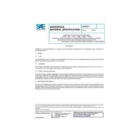 SAE AMS5924 Nickel Alloy, Corrosion and Heat-Resistant, 47.5Ni - 22Cr - 1.5Co - 9.0Mo - 0.60W - 18.5Fe Powder for General Applications including Metal Injection Molding and Additive Manufacturing without Special Powder Manufacturing Controls