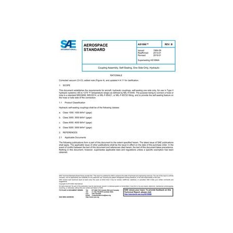 This document establishes the requirements for aircraft, hydraulic couplings, self-sealing one side only, for use in Type II hydraulic systems (-65 to +275 degrees F temperature range) as defined by MIL-H-5440. The purpose being to connect a hose or tube to a standard MS33656, MS33514, or MIL-F-85421, or MIL-F-85720 fitting, and to provide the self-sealing feature on the hose or tube side of the connection.