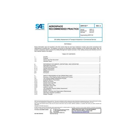 This document describes guidelines, methods, and tools used to perform the ongoing safety assessment process for transport airplanes in commercial service (hereafter, termed 'airplane'). The process described herein is intended to support an overall safety management program. It is associated with showing compliance with the regulations, and also with assuring a company that it meets its own internal standards. The methods identify a systematic means, but not the only means, to assess ongoing safety.While economic decision-making is an integral part of the safety management process, this document addresses only the ongoing safety assessment process. To put it succinctly, this document addresses the 'Is it safe?' part of safety management; it does not address the 'How much does it cost?' part of the safety management.This document also does not address any specific organizational structures for accomplishing the safety assessment process. While the nature of the organizational structure is significant to the quality of a safety program, this document focuses on the functions to be accomplished and does not attempt to define what the structure should be. The intent is to leave the greatest amount of flexibility to the organizations that use this document.