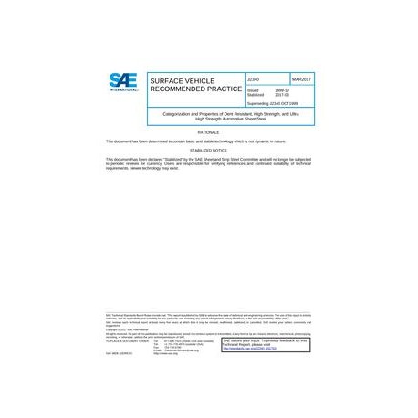 SAE J2340_201703 defines and establishes mechanical property ranges for sevengrades of continuously cast high strength automotive sheet steels that can be formed, welded, assembled,and painted in automotive manufacturing processes. The grade of steel specified for an identified part shouldbe based on part requirements (configuration and strength) as well as formability. Material selection shouldalso take into consideration the amount of strain induced by forming and the impact strain has on the strengthachieved in the finished part. These steels can be specified as hot-rolled sheet, cold-reduced sheet,uncoated, or coated by hot dipping, electroplating, or vapor deposition of zinc, aluminum, and organiccompounds normally applied by coil coating. The grades and strength levels are achieved through chemicalcomposition and special processing. Not all combinations of strength and coating types may be commerciallyavailable. Consult your steel supplier for details.