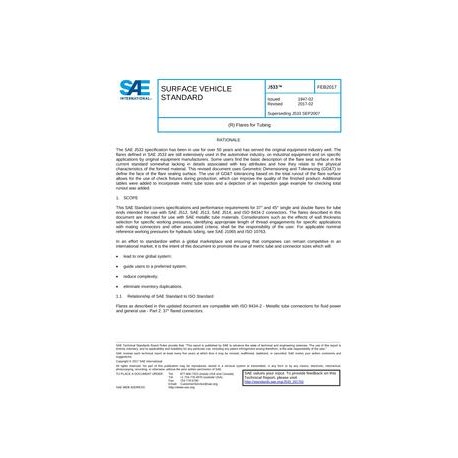 This SAE Standard covers specifications and performance requirements for 37° and 45° single and double flares for tube ends intended for use with SAE J512, SAE J513, SAE J514, and ISO 8434-2 connectors. The flares described in this document are intended for use with SAE metallic tube materials. Considerations such as the effects of wall thickness selection for specific working pressures, identifying appropriate length of thread engagements for specific applications with mating connectors and other associated criteria, shall be the responsibility of the user. For applicable nominal reference working pressures for hydraulic tubing, see SAE J1065 and ISO 10763.