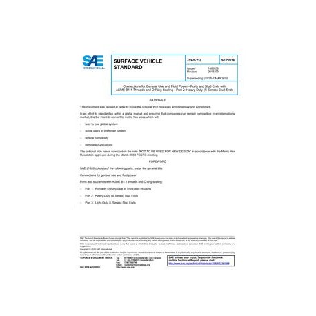 This part of SAE J1926 specifies dimensions, performance requirements, and test procedures for adjustable and nonadjustable heavy-duty (S series) stud ends with ASME B1.1 threads for use in fluid power and general applications and the O-rings used with them that are currently not listed in SAE J515.