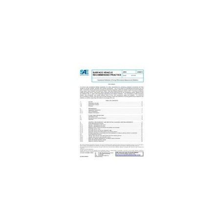 This Recommended Practice, Operational Definitions of Driving Performance Measures and Statistics, provides functional definitions of and guidance for performance measures and statistics concerned with driving on roadways. As a consequence, measurements and statistics will be calculated and reported in a consistent manner in SAE and ISO standards, journal articles proceedings papers, technical reports, and presentations so that the procedures and results can be more readily compared. Only measures and statistics pertaining to driver/vehicle responses that affect the lateral and longitudinal positioning of a road vehicle are currently provided in this document. Measures and statistics covering other aspects of driving performance may be included in future editions. For eye glance-related measures and statistics, see SAE J2396 (Society of Automotive Engineers, 2007) and ISO 15007-1 (International Standards Organization, 2002).
