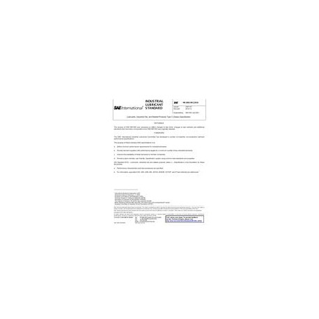 The SAE International Lubricants Committee has developed a number of industrial, non- production, lubricant performance specifications.The purpose of this voluntary SAE specifications is to: a. Define minimum performance requirements for industrial lubricants, where tests are available. b. Provide lubricant suppliers with performance targets for key industrial lubricants. c. Improve the availability of these lubricants to member companies. d. Provide a plant oriented, user friendly classification system using common test standards and properties.ISO Standard 6743, Lubricants, industrial oils and related products (class L) - Classification, is the foundation for these documents. a. Performance characteristics and test procedures are specified. b. For information, equivalent ISO, DIN, CEN, BSI, ASTM, AFNOR, CETOP, and IP test methods are referenced.