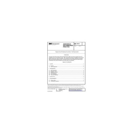 The present Aerospace Recommended Practice specifies for airplane operator and tow vehicle manufacturers the basic testing requirements for towbarless tow vehicles to be used on the nose gear of conventional tricycle type landing gears of commercial civil transport aircraft with maximum ramp weight between 8,600 kg (19,000 lb) and 50,000 kg (110,000 lb), commonly designated as "regional aircraft".Its purpose is to achieve testing results, or equivalent computer modeling, demonstrating that the loads induced by the tow vehicle will not exceed the design loads of the airplane's nose landing gear and associated structure, reduce the certified safe life limit of the nose landing gear, or otherwise compromise the airplane's structural integrity and airworthiness certification.This document is intended to be applicable to all towbarless tow vehicles to be used for push-back and maintenance towing of commercial airplanes in the specified range. See Section 3 hereafter. It is not intended to apply to tow vehicles used for airplane operational (dispatch) towing.