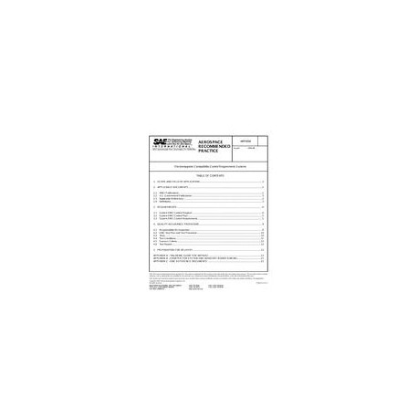 This SAE Aerospace Recommended Practice (ARP) establishes overall system electromagnetic compatibility (EMC) control requirements. EMC includes the following: a. electromagnetic environmental effects (E\u3); b. electrostatic discharge (ESD); c. electromagnetic interference (EMI); d. electromagnetic vulnerability (EMV); e. electromagnetic pulse (EMP); f. hazards of electromagnetic radiation to ordance (HERO); g. hazards of electromagnetic radition to personnel (HERP); h. hazards of electromagnetic radiation to fuels (HERF); i. High intensity radiated fields (HIRF); j. lightning protection; k. static electricity; and l. TEMPEST.This document is intended to be used for the procurement of land, sea, air, or space systems by any procurement activity. Tailoring of specific requirements is necessary and Appendix A has been provided for guidance.