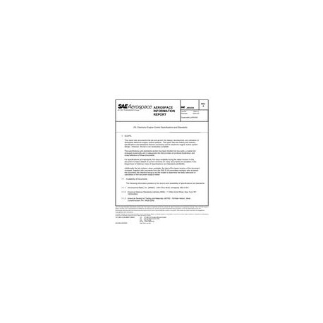 This report lists documents that aid and govern the design, development, and utilization of aerospace electronic engine control systems. The report lists the military and industry specifications and standards that are commonly used in electronic engine control system design. However, this list is not necessarily complete.The specifications and standards section has been divided into two parts; a master list arranged numerically and a categorized list that provides a functional breakdown and cross-reference of these documents.For specifications and standards, the issue available during the latest revisionto this document is listed. Details of current revisions for many documents are available in the Department of Defense Index of Specifications and Standards (DODISS).Additional the list contains, when available, the date of the latest revision of the document reviewed, together with comments from the SAE E-36 committee members who reviewed the document, the intention being to aid the reader to determine the likely relevance or usefulness of the document subject matter.