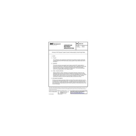 This specification covers engineering requirements for the grinding of tungsten carbide High Velocity Oxygen/Fuel (HVOF) thermal spray coatings applied to high strength steels (220 ksi and above).This process has been used typically to grind tungsten carbide HVOF coatings applied in accordance with AMS 2447 or AMS 2448 to high strength steels for applications requiring wear, heat, and corrosion resistance or dimensional restoration, such as aircraft landing gear components, However, usage is not limited to such applications. This process specification does not cover superfinishing of HVOF applied coatings.